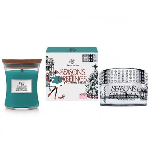 The set is packed in a Premium gift box.The hand cream and candle set includes Alessandro Seasons Greetings Hand Cream 100ml and Woodwick Mini Candle (dimensions: 7cm x 7cm x 8.3cm, burns for up to 35 hours).