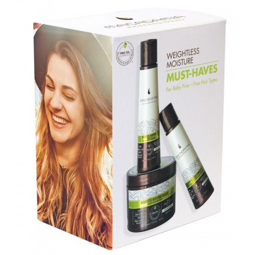 Macadamia Professional Weightless Moisture Must-Haves Set contains:Weightless Moisture Shampoo 100ml – volume-boosting product designed to cleanse fine, thinning, or limp hair without weighing it down. It features our exclusive Pro Oil Complex with Macadamia and Argan Oils that instantly revives, strengthens and rejuvenates hair, while lightweight Avocado and Walnut Oils provide moisture and nutrients.Weightless Moisture Conditioner 100ml – ultra-lightweight formula that won’t weigh down finer hair textures, allowing for more lift, body and volume. It contains the exclusive Pro Oil Complex of Macadamia and Argan Oils to help strengthen and repair while lightweight Avocado and Walnut Oils nourish and hydrate. A combination of Collagen and Vitamins A, C and E helps promote tensile strength. With continued usage, the Weightless Moisture Conditioner helps prevent breakage in even the finest hair textures.Weightless Moisture Mask 100ml – ultra-lightweight formula gives baby fine to fine hair textures all the benefits of a hair masque, without added weight. This hair masque for dry hair nourishes, conditions and strengthens the individual hair strands to help repair and prevent future breakage. It is infused with the exclusive Pro Oil Complex and Walnut Oil, which leaves hair detangled, frizz-free and smooth.