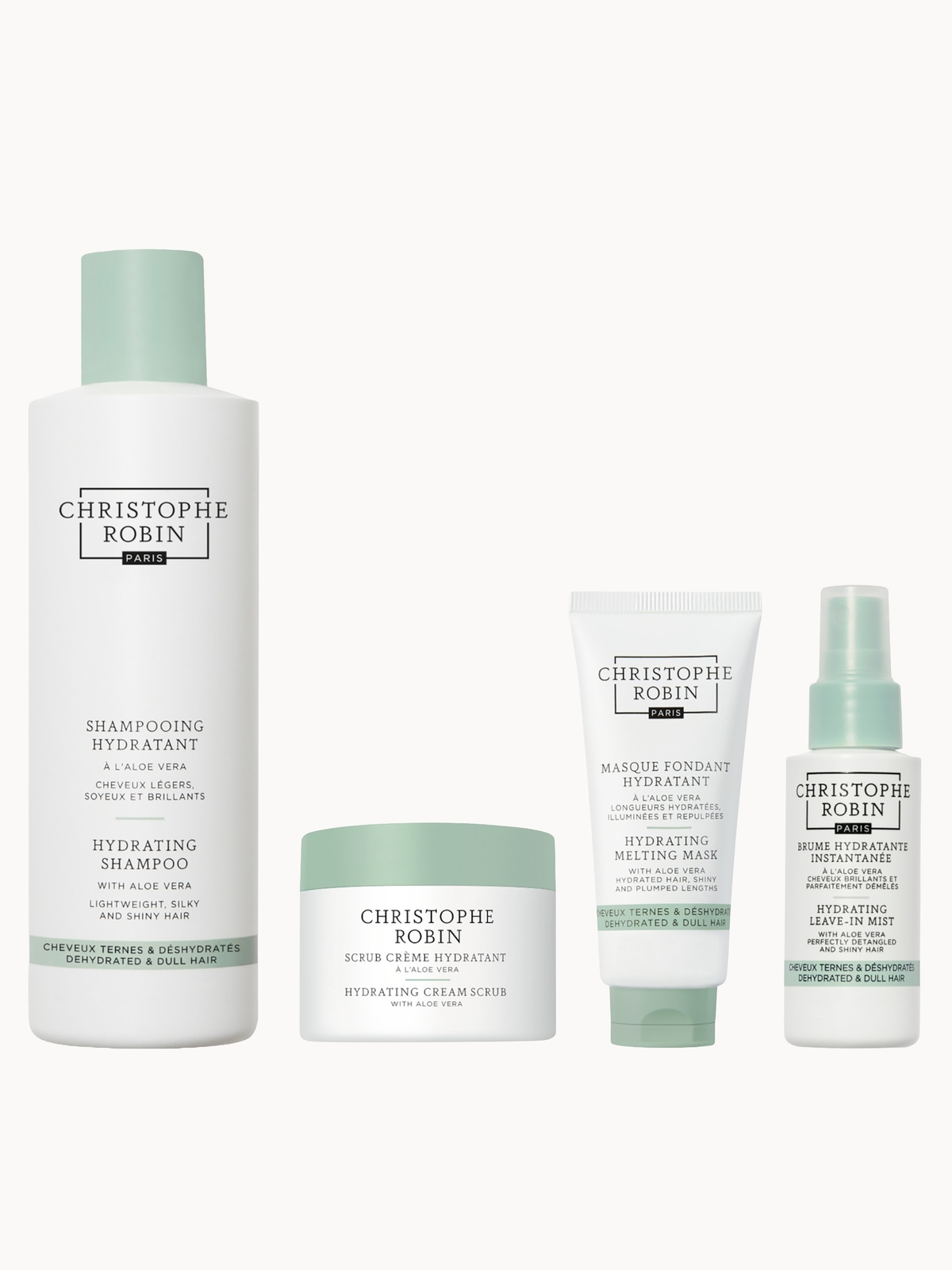 Forming a reparative haircare routine, the Christophe Robin Hydrating Bundle is a four-piece collection infused with naturally hydrating aloe vera. Featuring a shampoo, mist, scrub and mask, the aloe-infused collection seeks to nourish hair from root to tip to promote the appearance of softer, glossier hair.Set Contents: Christophe Robin Hydrating Shampoo with Aloe Vera 250mlSeeking to refresh the scalp of oil and impurities, this plant-powered shampoo helps to promote the appearance of revitalised lengths. Hair looks instantly shinier xand the scalp feels purified for the illusion of radiant hair. Christophe Robin New Hydrating Mist with Aloe Vera 50mlWorking like a leave-in conditioner, the lightweight mist hydrates the hair while helping to create enough slip for effortless detangling. Ideal for refreshing hair in between washes, the mist lends luminous shine to lengths while wrapping strands in a refreshing fragrance.Christophe Robin New Hydrating Scrub 40mlForming the first part in a hydrating haircare routine, the pre-shampoo scrub exfoliates the scalp to help remove build up.Christophe Robin New Hydrating Melting Mask with Aloe Vera 40mlFormulated with an ultra-light texture, the hair mask melts instantly into the hair to help smooth down lengths and impart a high-shine finish.