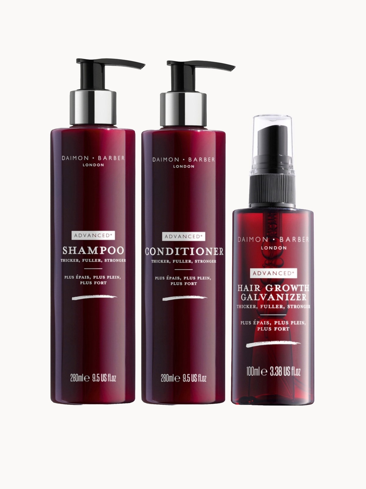 Designed for hair prone to thinning and fallout, the Daimon Barber Hair Care Trio unites a shampoo, conditioner and mist to promote thicker, fuller-looking hair and protect against breakage and hair fall. Set Contents: Daimon Barber Advanced Plus Shampoo 280ml The Daimon Barber shampoo cleanses the hair and scalp by removing oil, dead skin and build-up that can cause blocked hair follicles. Infused with 12 botanical plant extracts, including peppermint, cedarwood and rosemary oils, the formula nourishes the scalp to promote optimal conditions for hair growth. Daimon Barber Advanced Plus Conditioner 280ml The conditioner detangles and nourishes while promoting visibly fuller and stronger hair. Infused with a blend of glycerin and avocado oil, each strand is drenched in fatty acids, vitamins, and antioxidants for hydration and nourishment. Daimon Barber Hair Growth Galvanizer 100ml A pioneering treatment mist that improves the appearance of hair thickness, strength and volume. The formula features procapil and redensyl to help minimise the risk of breakage while defending against dust and pollutants.