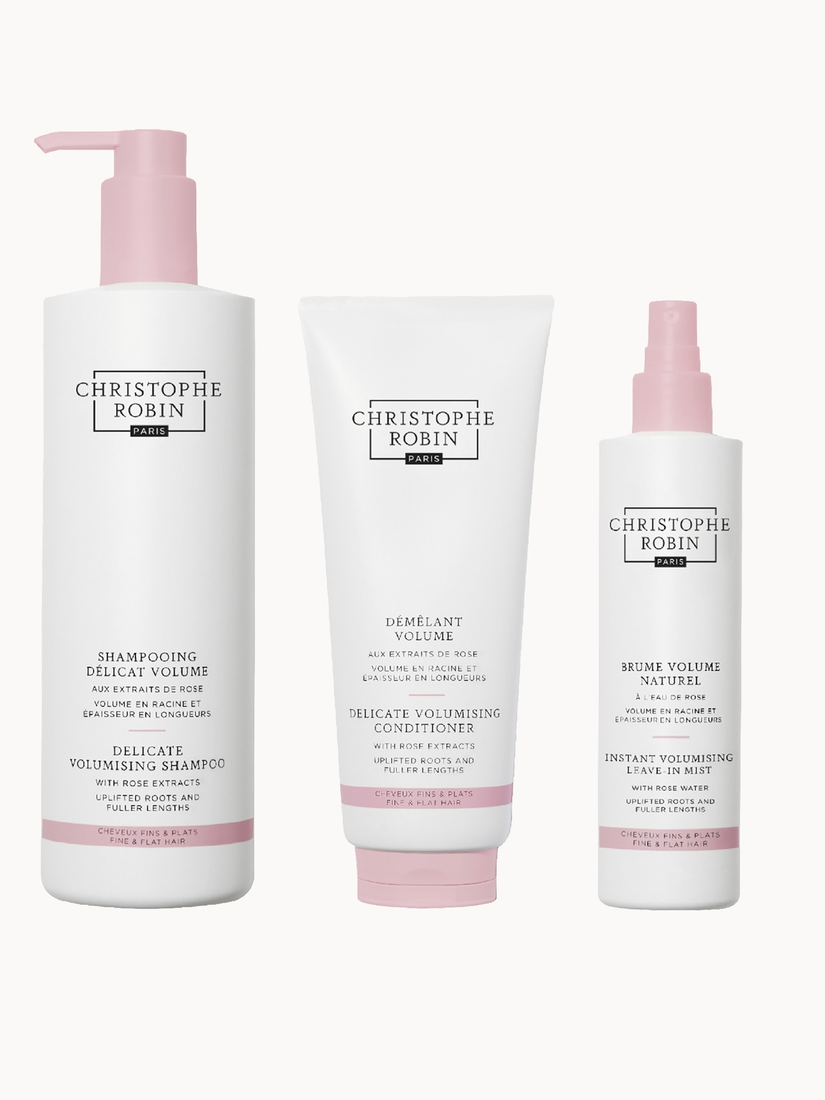 Perfect for fine hair, the Exclusive Christophe Robin Volumising Regimen Bundle is designed to build body and shape in limp or thinner strands.Set Contents:Delicate Volumising Shampoo with Rose Extracts 500mlA gel-textured shampoo to create volume and fullness – all while cleansing fine hair of dirt and impurities.Delicate Volumising Conditioner with Rose Extracts 200mlThis lightweight conditioner delivers a shot of volume to fine or flat hair, supporting a fuller-looking mane with a soft, manageable finish.Instant Volumising Leave-in Mist with Rose Water 150mlDelivering nourishing benefits, this leave-in hair mist wraps your strands in its body-building formula. It helps to deliver natural-looking hold with enhanced fullness and shape, promoting a thicker appearance.