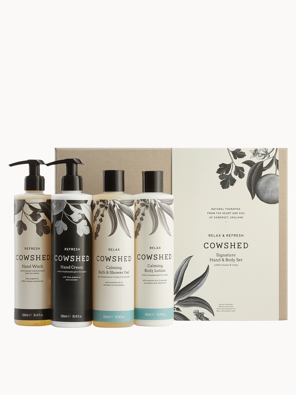 The Cowshed Signature Hand & Body Set is expertly put together to help elevate your self-care routine. Designed to uplift the senses and nourish the skin, this four-piece set is crafted with bespoke blends of essential oils, tailored to renew a sense of well-being with every use. Set Contents: Relax Shower Gel 300ml Thanks to an all-natural fragrance, the shower gel is enriched with the scent and soothing properties of lavender and eucalyptus essential oils, making it perfect for an evening shower or bath. Relax Body Lotion 300ml Topped with a blend of shea and cocoa butter to provide long-lasting hydration, the lotion is infused with lavender and eucalyptus essential oils to help visibly soothe and nourish. Refresh Hand Wash 300ml Perfect for hardworking hands, the refreshing cleanser boasts a blend of grapefruit, bitter orange, lavender essential oils and vitamin E to help gently yet effectively clean and nourish, while leaving skin lightly scented with a fresh fragrance. Refresh Hand Lotion 300ml Offering long-lasting nourishment and moisture, the luxurious lotion harnesses a blend of shea and cocoa butters to help condition and hydrate the skin. Infused with a natural citrus floral aroma, the cream leaves hands feeling irresistibly soft.