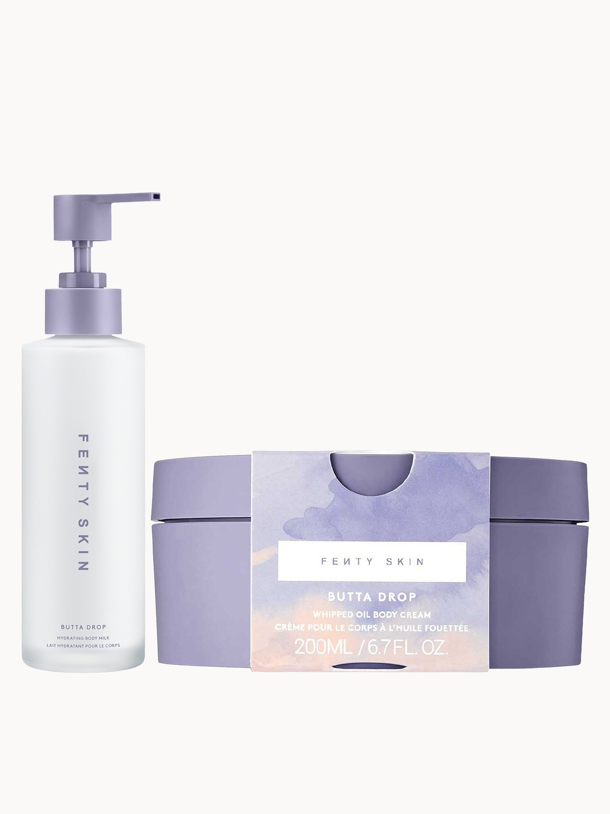 The Fenty Beauty Body Duo unites two bodycare treatments to hydrate, soften and smooth the skin while granting a natural-looking glow. Set Contents: Butta Drop Hydrating Body Milk 185ml The milky texture delivers a lightweight, refreshing burst of moisture with tropical oils and butters, leaving skin smooth and nourished. Butta Drop Whipped Oil Body Cream with Tropical Oils + Butters 200ml The rich cream envelops the body in a smooth, dewy finish, blending seven tropical oils and butters for a soft, radiant feel.
