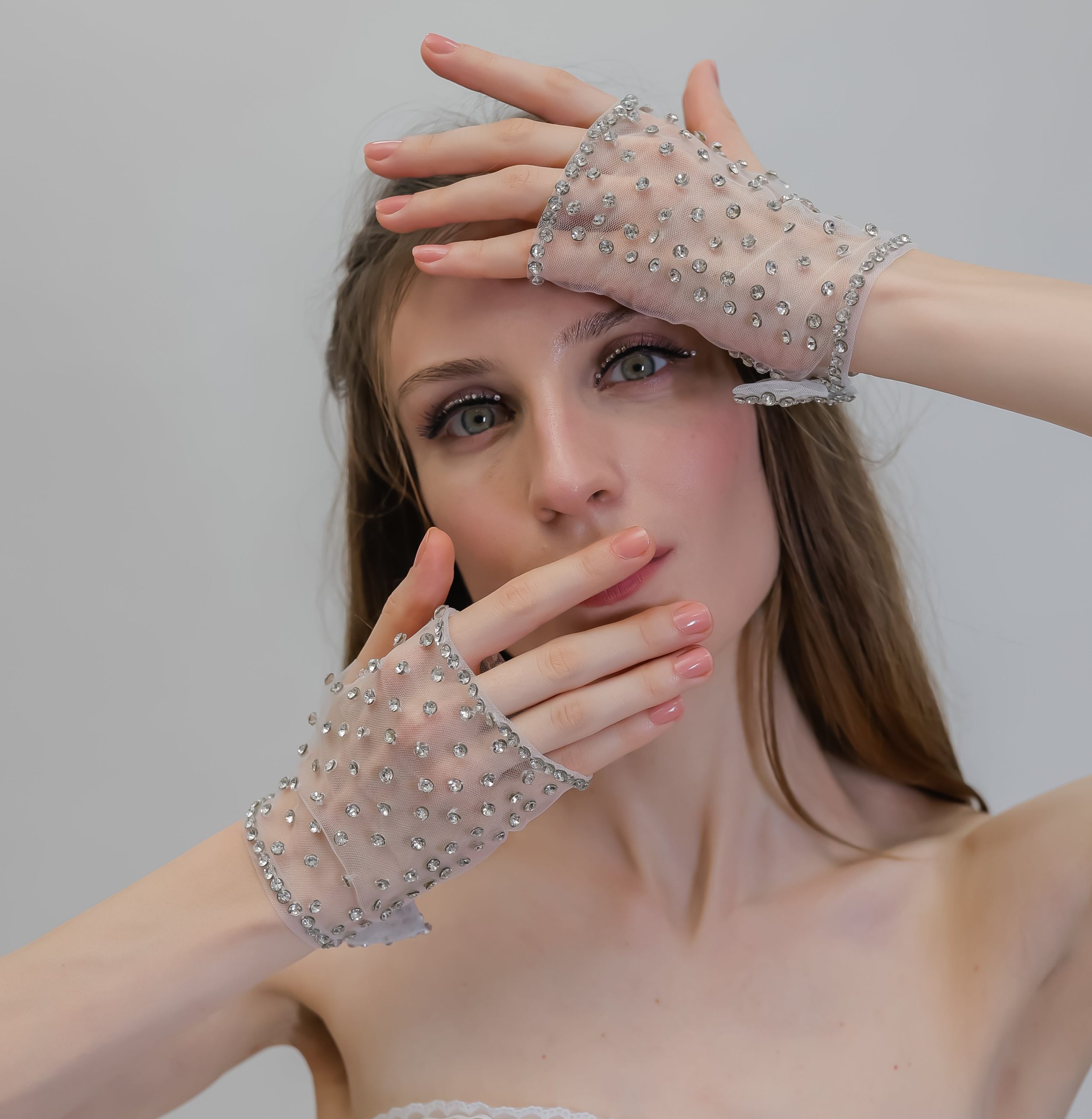 KerryParkerStore’s The RIRI Gloves @kerryparkerofficialShop the FULL “Barbie Bride” collection by KERRY PARKER! https://www.etsy.com/in-en/shop/KerryParkerStore?ref=shop-header-name&listing_id=1514177200§ion_id=44048114“Barbie has Landed & so have we! Presenting our “Barbie Bride” Capsule- to make ALL your Bridal Barbie dreams come true ” A classic Short Fingerless pair crafted out of the finest silk tulle, Heavily embellished with Zirconia jewels evenly spaced out throughout the scape with a Little Bejeweled Bow on Top! Here’s one for all your Fun Bachelorette plans!Made to order and fabricated by handMaterial: Silk Tulle, Zirconia embellishments, SequinsThe material has stretch© 2023, Kerry Parker, Stylar Footwear Industries